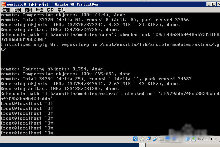 在命令行,提取Ansible源代碼,git clone git://github.com/ansible/ansible.git --recursive 如下圖所示