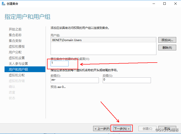 9、這里設(shè)置虛擬桌面發(fā)布的數(shù)量(數(shù)量和完成的速度相關(guān),數(shù)量越多,部署越慢)和虛擬桌面前綴等信息,設(shè)置完成后,單擊“下一步”: