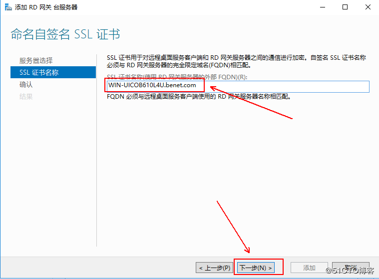 6、這里需要輸入的是RD服務(wù)器(也就是這個服務(wù)器本身)的完全名稱,然后單擊“下一步,”如下所示: