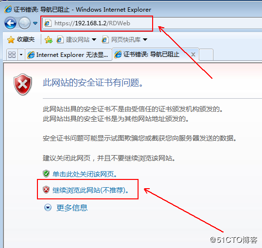 1、在客戶端打開瀏覽器輸入:https://192.168.1.2/RDWeb (此ip為RD服務(wù)器的ip地址),因為沒做CA認(rèn)證,所以瀏覽器證書不受信任,單擊“繼續(xù)瀏覽此網(wǎng)站(不推薦)”即可。便能打開虛擬機(jī)登錄界面。