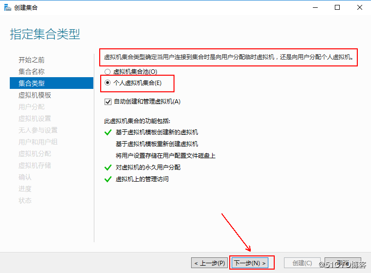 4、在“指定集合類型”如果采用每個用戶專有虛擬桌面,可選中“個人虛擬機(jī)集合”,然后單擊下一步,反之,可選擇“虛擬機(jī)集合池”,這里可根據(jù)實際需求來定義: