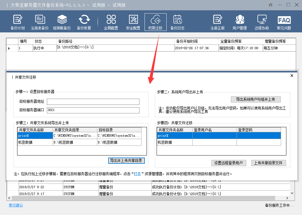 同時,通過大勢至服務(wù)器文件自動備份系統(tǒng)還可以實現(xiàn)只讓將一個服務(wù)器上的文件或文件夾以及對應(yīng)的賬號,全部遷移到另外一個服務(wù)器,從而避免了重新設(shè)置賬戶和文件訪問權(quán)限的麻煩。如下圖: