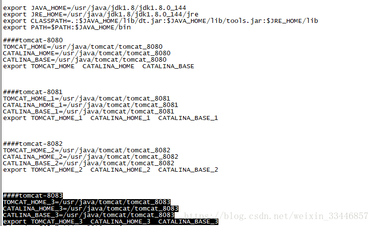 添加第4個tomcat環(huán)境變量配置后,如圖,這里要注意的是要寫自己tomcat對應(yīng)的路徑,因為我第四個tomcat所在的路徑就是 /usr/java/tomcat/tomcat_8083