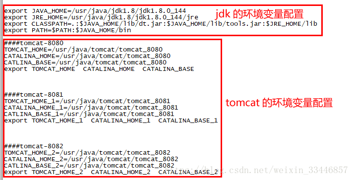 打開profile文件之后,我們可以看到這里有我們配置的jdk環(huán)境變量,還有我已經(jīng)配置好的前三個tomcat,下面我們按照第三個tomcat的配置(tomcat-8082)復(fù)制出來一份,更改相應(yīng)的名字即可。