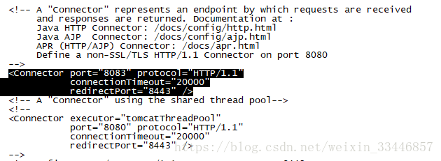 (2): 找到<Connector port="8080" protocol="HTTP/1.1" connectionTimeout="20000" redirectPort="8443" /> 將端口號改為8083,這個8083就是我這第四個tomcat的端口號