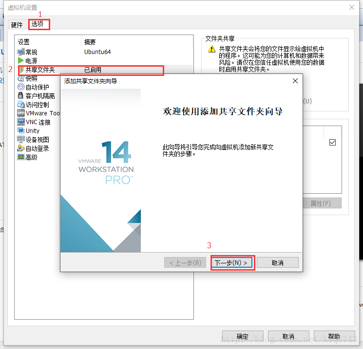 2.彈出的對(duì)話框中依次點(diǎn)擊“選項(xiàng)”、“共享文件夾”、“下一步”