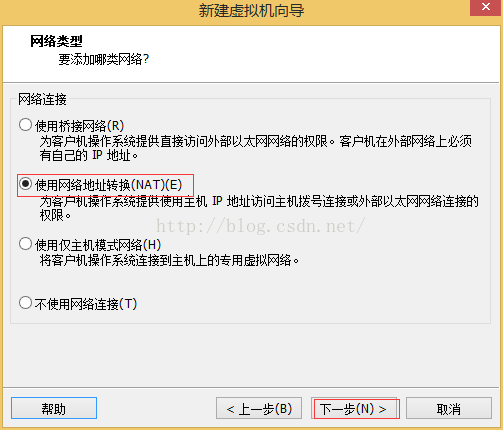10、選擇網(wǎng)絡(luò)連接“使用網(wǎng)絡(luò)地址轉(zhuǎn)換(NAT)(E)”,然后點擊“下一步”;