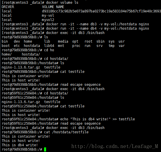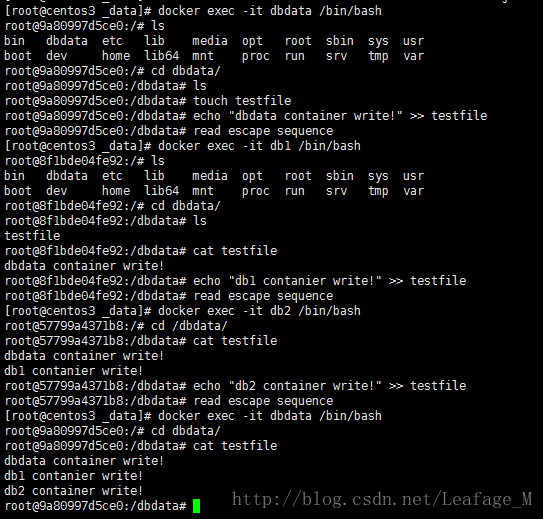 3.然后此時在三個容器中任何一方在/dbdata目錄下的寫入,其他容器中都可以看到。