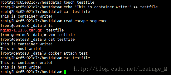 在這里我在容器中創(chuàng)建一個文件testfile并向其中寫入:This is container write!,然后回到主機(jī)進(jìn)行查看,并在主機(jī)中使用vim向其中添加:“This is host write!”,并返回容器中進(jìn)行查看。