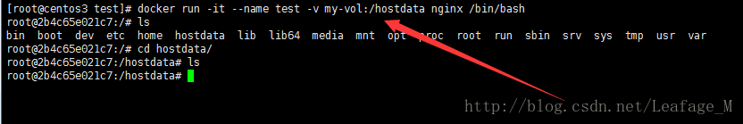 可以看到通過-v命令將剛才創(chuàng)建的數(shù)據(jù)卷掛載到容器中的hostdata目錄下了,這時候我們在容器中給hostdata目錄下添加文件的時候,在主機(jī)的的/var/lib/docker/volumes/my-vol/_data中就可以看到了,同理在主機(jī)的該目錄中添加文件,在容器的hostdata中也可以看到。
