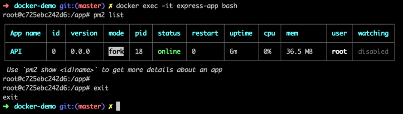與 exec 類似的還有 attach 命令,命令為 docker attach express-app,但從這個 stdin 中 exit,會導致容器的停止,所以推薦使用 exec 命令。