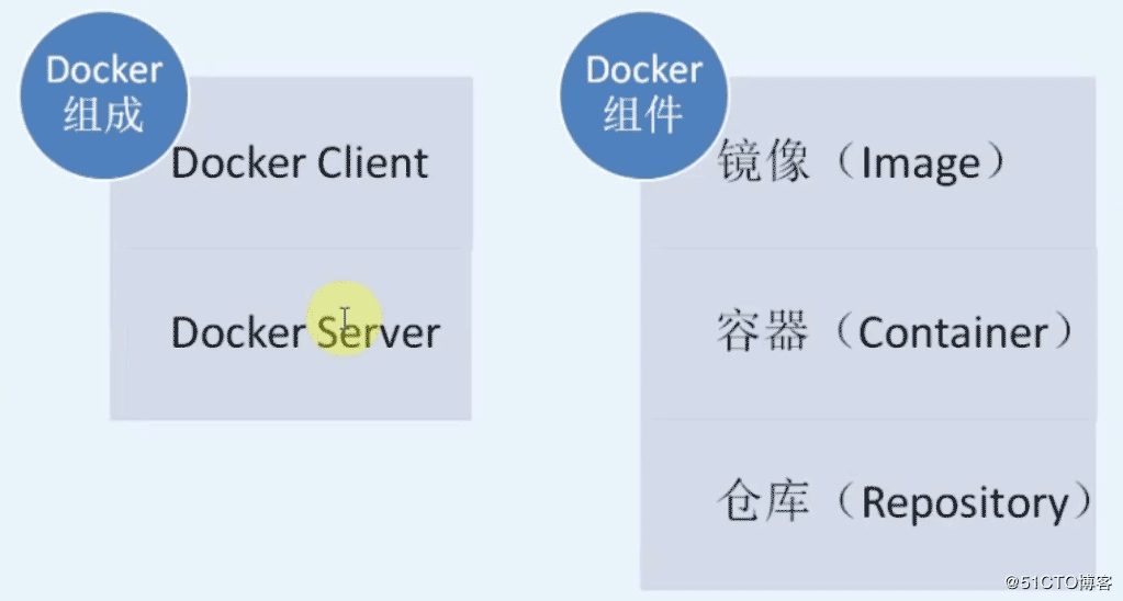 docker的組成包括docker server和dockerclient,其中docker包括的組件:容器(container)、鏡像(image)和倉(cāng)庫(kù)(repositories),如下圖: