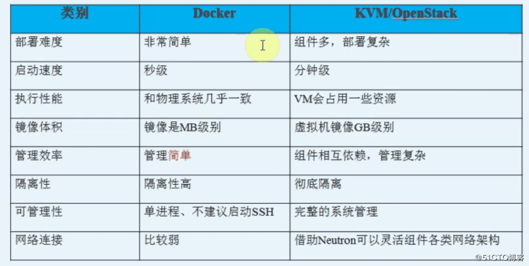 通過(guò)比較,我們可以看出,VM其實(shí)是在硬件的基礎(chǔ)上虛擬化(hypervisor)出來(lái)的操作系統(tǒng),多個(gè)VM之間共享底層硬件資源。而docker是在Linux基礎(chǔ)上采用Namespace和CGroups技術(shù)進(jìn)行的隔離,這就造就了docker既可以運(yùn)行在硬件操作系統(tǒng)之上,也可以運(yùn)行在VM之上。2者的區(qū)別也決定了,2者的差異,這里總結(jié)了兩者的差異,匯總?cè)缦拢?/p>