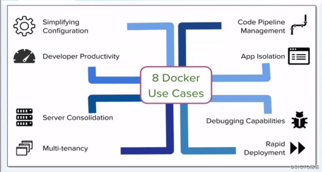 docker既然存在這樣的特性,那么docker可以做什么呢?下圖給出了docker的8種場(chǎng)景,而作者從實(shí)際的工作出發(fā),主要采用docker將現(xiàn)有產(chǎn)品的發(fā)布流程精簡(jiǎn)化,減少了大量的環(huán)境配置工作,由于docker的隔離性,可以將應(yīng)用程序打包成docker鏡像,同一個(gè)產(chǎn)品不同版本可以打包成不同的鏡像,這也方便了測(cè)試的工作。
