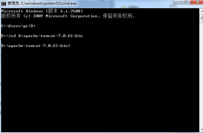 第一步:使用cmd命令進入到你的tomcat文件下的bin目錄,我的tomcat在D盤