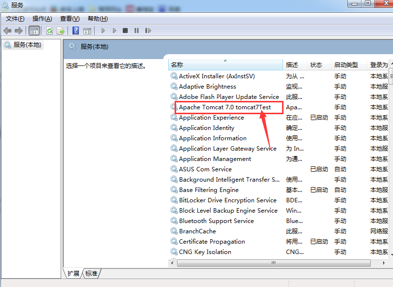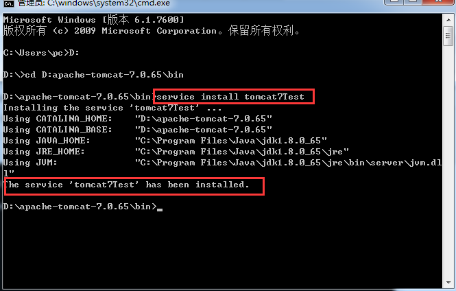 tomcat7Test是服務(wù)名,可以隨便取值,默認為tomcat7,可以看到服務(wù)已經(jīng)成功安裝,接下來取服務(wù)里面