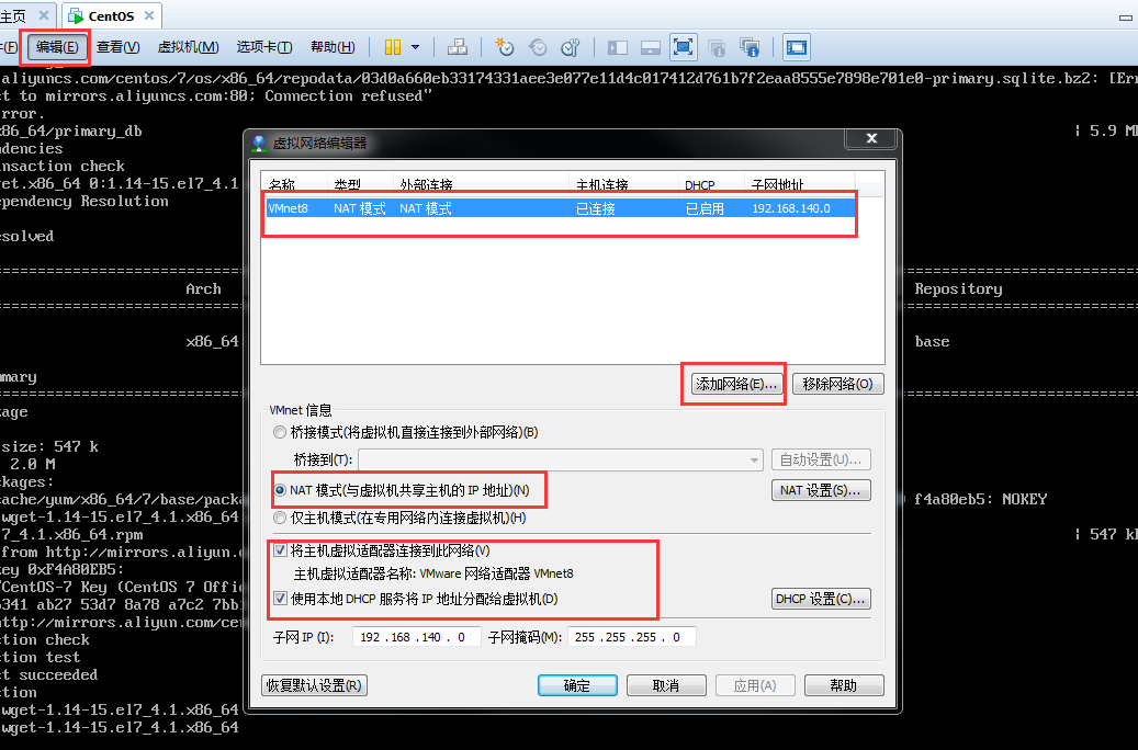 3.編輯->虛擬網(wǎng)絡編輯器->添加網(wǎng)絡->Vmnet8(DHCP和NAT設置都采用默認的)->確定