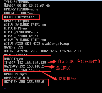 6.編輯網(wǎng)卡,vi ifcfg-ens33,你們的可能為ensxxx,跟據(jù)自己的機器而定,修改或增加下圖的六個配置項,其中GATEWAY,DNS1由第三步生成。