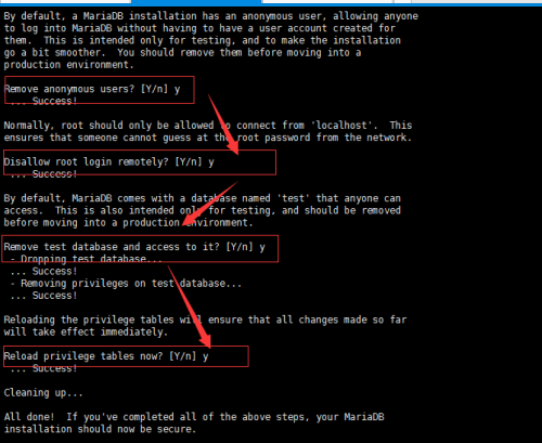 注意:在上圖中的Enter current passwdord for root處,我們直接敲回車鍵即可。因?yàn)閏entos7上mysql的默認(rèn)root用戶密碼為空。上圖中主要是為root用戶配置密碼,并刷新相關(guān)權(quán)限。(密碼設(shè)為123456,只為實(shí)驗(yàn)用,生產(chǎn)環(huán)境自定義)Remove anonymous users?刪除匿名用戶?Disallow root login remotely? 禁止root遠(yuǎn)程登陸Remove test database and access to it? 刪除測(cè)試數(shù)據(jù)庫并且和訪問它Reload privilege tables now? 重新載入特權(quán)表上圖中主要是配置匿名用戶、test用戶以及root用戶遠(yuǎn)程連接等相關(guān)配置。