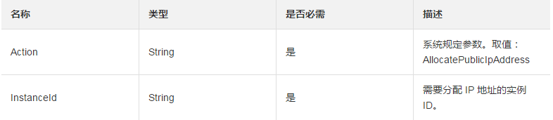 https://ecs.aliyuncs.com/?Action=AllocatePublicIpAddress