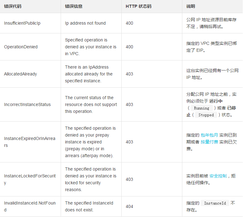 一臺(tái)實(shí)例只能分配一個(gè)公網(wǎng) IP 地址。如果實(shí)例已經(jīng)擁有一個(gè)公網(wǎng) IP 地址,將報(bào)錯(cuò) AllocatedAlready。