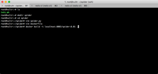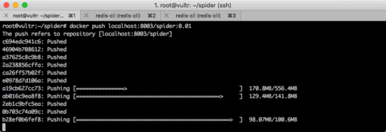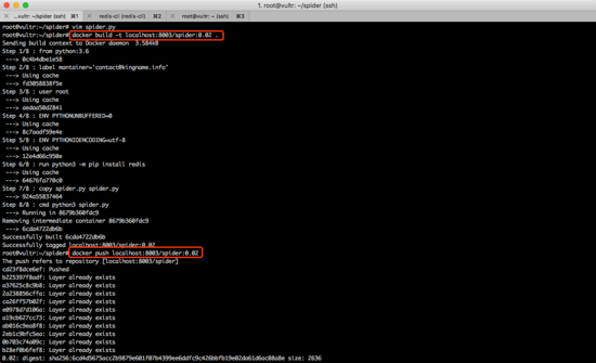 這里需要特別注意,由于我們要把這個(gè)鏡像上傳到私有源供Slave服務(wù)器上面的從節(jié)點(diǎn)下載,所以鏡像的命名方式需要滿足 localhost:8003/自定義名字:版本號(hào) 這樣的格式。其中的 自定義名字 和 版本號(hào) 可以根據(jù)實(shí)際情況進(jìn)行修改。在本文的例子中,我由于要模擬一個(gè)爬蟲(chóng)的程序,所以給它取名為spider,由于是第1次構(gòu)建,所以版本號(hào)用的是0.01。