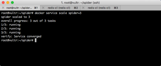 現(xiàn)在,只有1臺(tái)服務(wù)器運(yùn)行了一個(gè)容器,我想使用3臺(tái)服務(wù)器運(yùn)行這個(gè)爬蟲(chóng),那么我需要執(zhí)行一條命令即可: