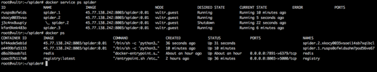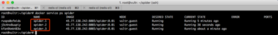 這個(gè)命令創(chuàng)建了一個(gè)名為 spider 的服務(wù)。默認(rèn)運(yùn)行1個(gè)容器。運(yùn)行情況如下圖所示。