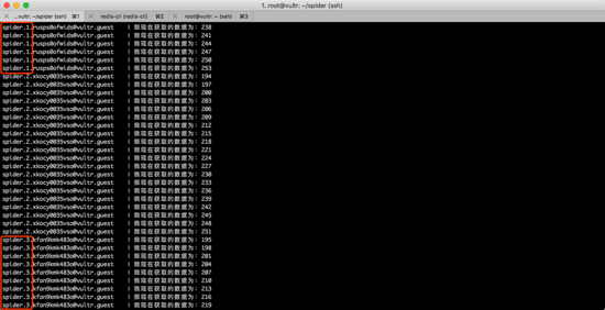 此時(shí),再一次查看爬蟲(chóng)的運(yùn)行情況,可以發(fā)現(xiàn)三臺(tái)機(jī)器上面會(huì)各自運(yùn)行一個(gè)容器。如下圖所示。
