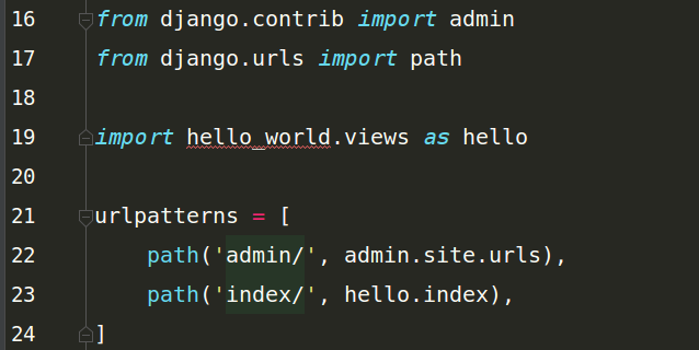 urlpatterns = [ ]是一個列表,里面裝著這個項目中所有網(wǎng)頁的路徑,index/時我們剛剛寫的hello,world的網(wǎng)頁地址,hello.index時hello下的一個函數(shù),但是我們時導入了hello_world應用下的views.py文件當作hello來用,所以hello.index也就是hello_world應用下的views.py文件下的一個函數(shù)。