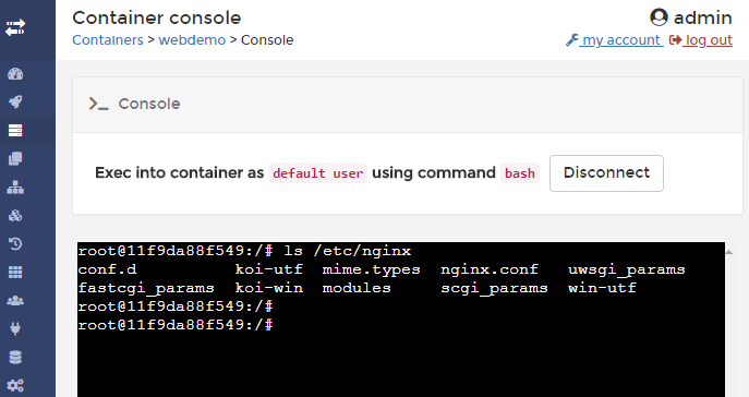 通過(guò)控制臺(tái)視圖我們可以在容器中執(zhí)行命令: