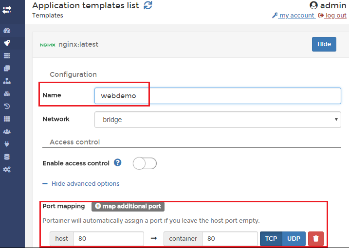 在容器屬性的配置界面中,指定容器的名稱為 webdemo,然后在高級(jí)選項(xiàng)中設(shè)置把宿主機(jī)的 80 端口映射到容器中的 80 端口: