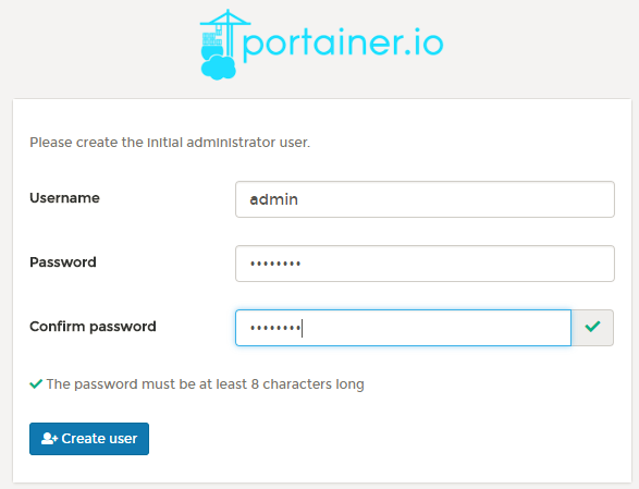 第一次訪問(wèn) portainer 時(shí)需要設(shè)置管理員的賬號(hào)信息,我們把管理員賬號(hào)命名為 admin 并設(shè)置密碼: