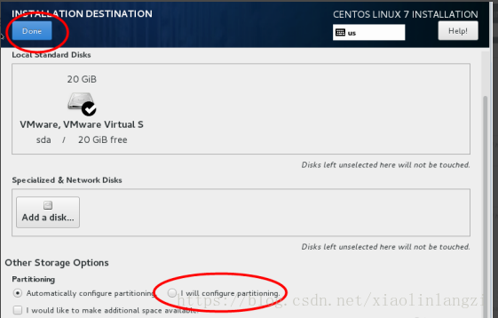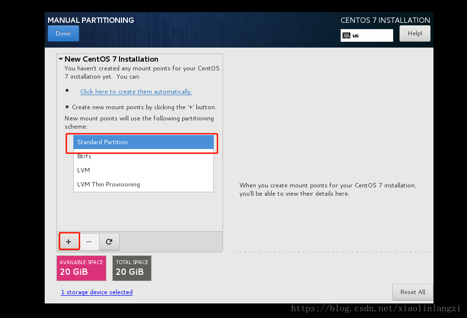 新掛載點使用以下分區(qū)方案:標(biāo)準(zhǔn)Standard Partition,完成Done。