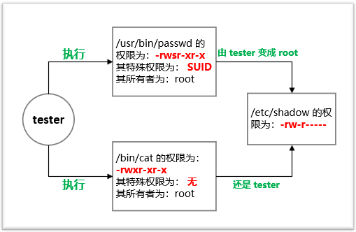 原因很清楚,tester 用戶沒有讀 /etc/shadow 文件的權(quán)限,同時(shí) cat 程序也沒有被設(shè)置 SUID。我們可以通過下圖來理解這兩種情況: