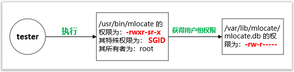 普通用戶 tester 執(zhí)行 mlocate 命令時(shí),tester 就會(huì)獲得用戶組 mlocate 的執(zhí)行權(quán)限,又由于用戶組 mlocate 對(duì) mlocate.db 具有讀權(quán)限,所以 tester 就可以讀取 mlocate.db 了。程序的執(zhí)行過程如下圖所示: