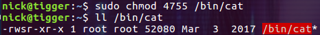 $ sudo chmod 4755 /bin/cat
