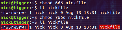 執(zhí)行 chmod 7666 nickfile,因?yàn)?666 表示 "-rw-rw-rw",均沒有 x 權(quán)限,所以最后變成了 "-rwSrwSrwT"。