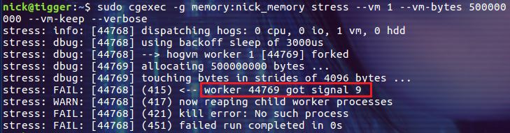 $ sudo cgexec -g memory:nick_memory stress --vm 1 --vm-bytes 500000000 --vm-keep --verbose