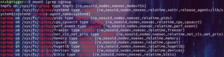 cgroups 以文件的方式提供應(yīng)用接口,我們可以通過 mount 命令來查看 cgroups 默認(rèn)的掛載點: