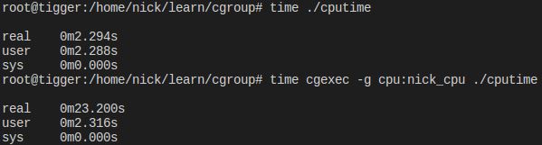 $ time cgexec -g cpu:nick_cpu ./cputime