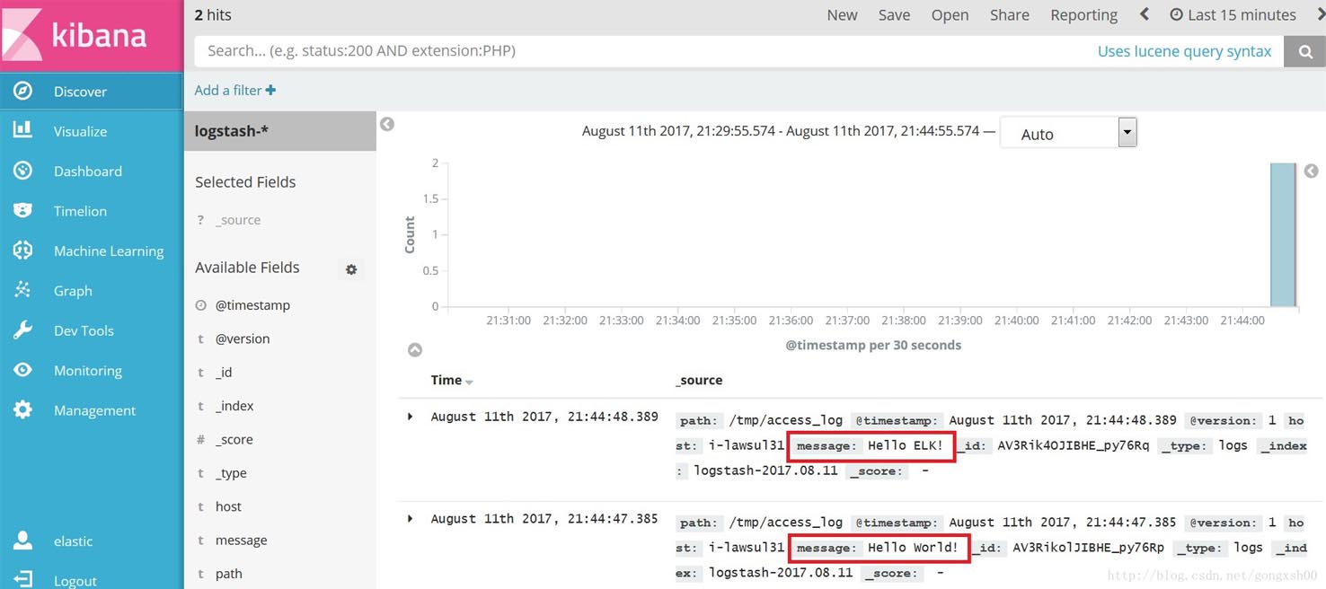 在Kibana點(diǎn)擊Discover菜單,可以看到相關(guān)的日志信息: