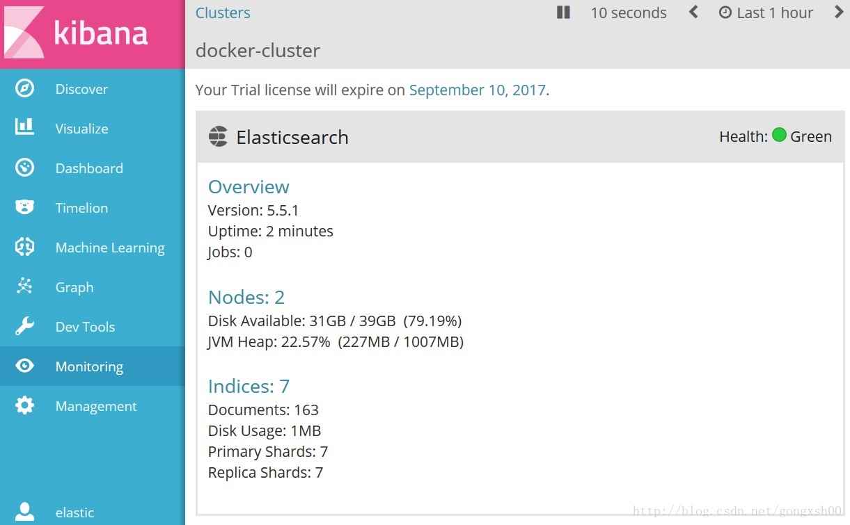 在Kibana中Monitor菜單中可以看到,Elastic Search集群已經(jīng)正常工作: