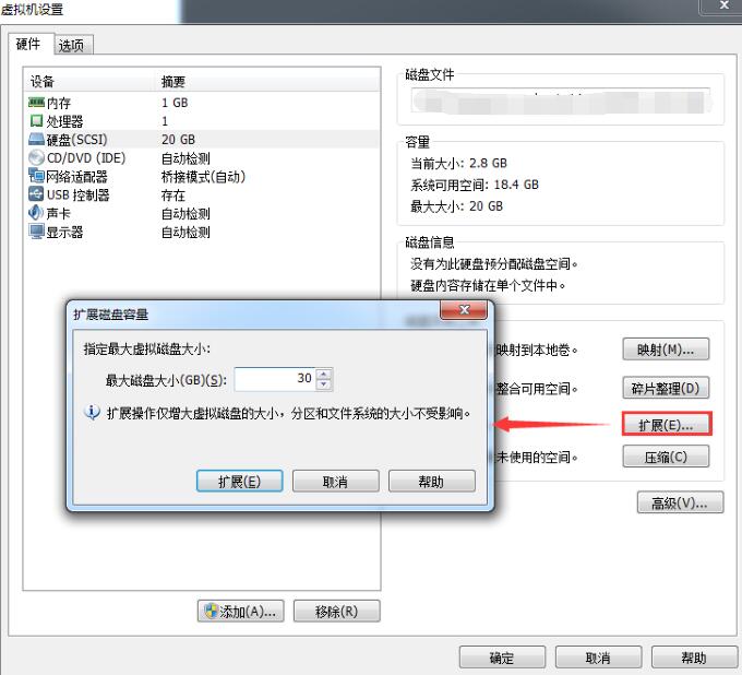 2. 增加磁盤(pán)空間,例如下圖使用VM虛擬機(jī)增加的方式。