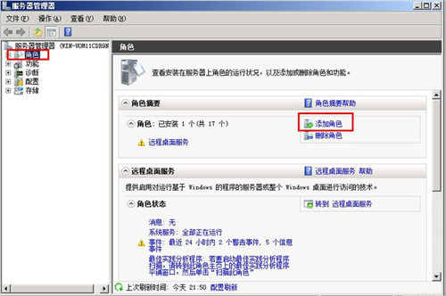 4、打開服務(wù)器管理器,選擇“角色”——點擊“添加角色”
