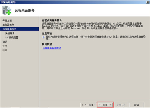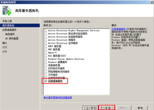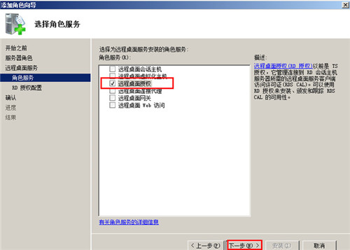 在角色服務(wù)里,選擇“遠(yuǎn)程桌面授權(quán)”,其它的可以根據(jù)其他工作需要,選擇是否添加: