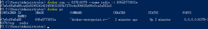 docker run -p 6378:6379 --name redis -d f06a5773f01e