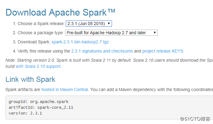 Pre-build for Hadoop 2.7 and later: 基于 Hadoop 2.7 的預(yù)先編譯版,需要與本機(jī)安裝的 Hadoop 版本對(duì)應(yīng)。可選的還有 Hadoop 2.6。我這里因?yàn)檠b的hadoop是3.1.0,所以直接安裝for hadoop 2.7 and later的版本。