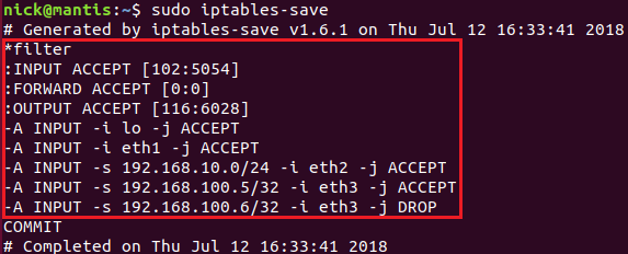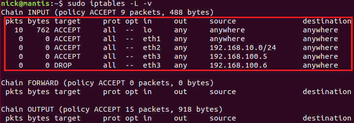 $ sudo iptables -A INPUT -i eth2 -s 192.168.10.0/24 -j ACCEPT