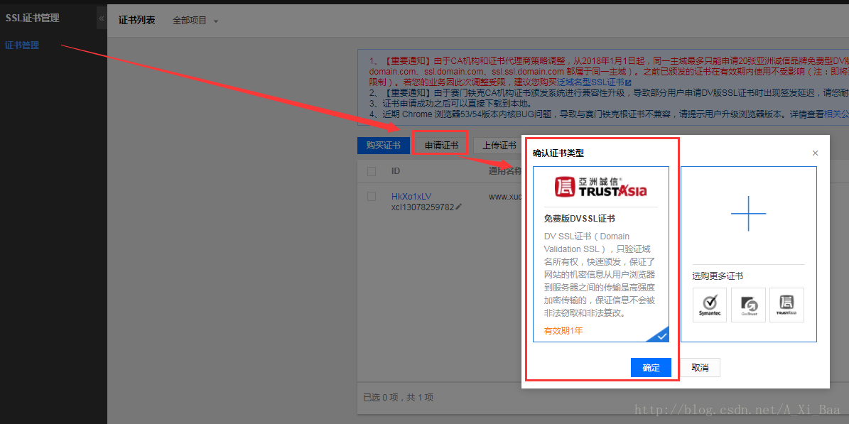 【2】點擊申請證書,苦逼就申請免費的吧,任性點的可以考慮購買。。。